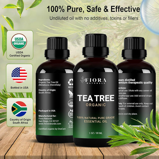 Tea Tree Essential Oil by Fiora Naturals- 100% Pure Organic Oil, for Face, Hair, Skin, Acne, Scalp, Foot and Toenails. Melaleuca Alternifolia, 1 oz /30ml