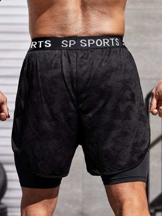 Men Letter Tape 2 In 1 Sports Shorts With Phone Pocket